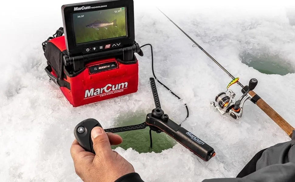 Place the MarCum Wireless Remote Camera Panner over an ice hole and with the push of a button scan a full panoramic 360-degrees from up to 30 feet away. Fold in legs for compact travel and storage. No more wires and no more replacing batteries, the internal rechargeable lithium battery offers up to 8 hours of service between charges.
